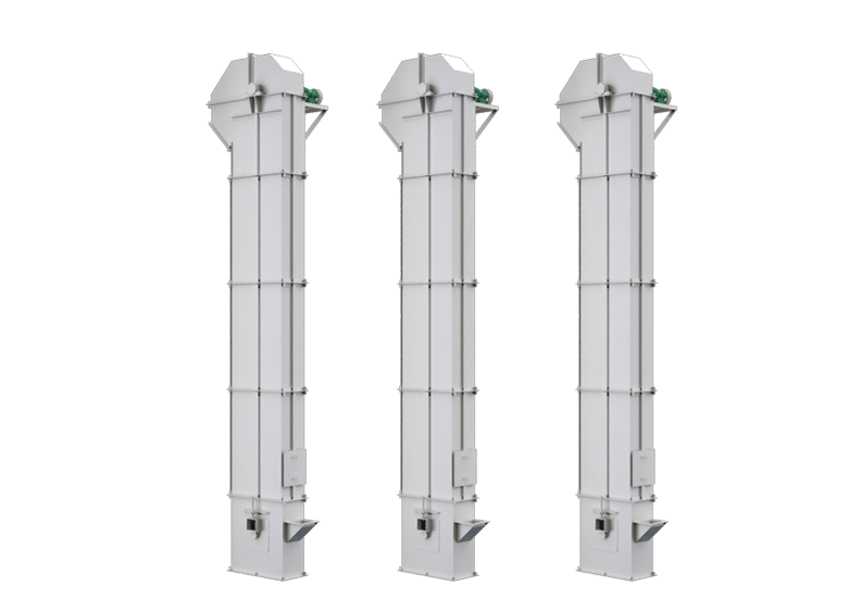 斗式提升机由料斗,牵引件,带有传动滚筒的上部区段、带拉紧滚筒的下部区段、中间机壳、驱动装置、逆止制动器等组成。带传动的斗式提升机传动带一般采用橡胶带,上下面分别装有传动滚筒和改向滚筒。链传动的斗式提升机一般装有两条平行的传动链,一条为传动链轮,另一条为改向链轮。根据不同需要可配置不同的传动装置,分为带传动和链传动。斗式提升机系流入式喂料,物料流入料斗内靠板链提升到顶部,在物料重力作用下自行卸料。