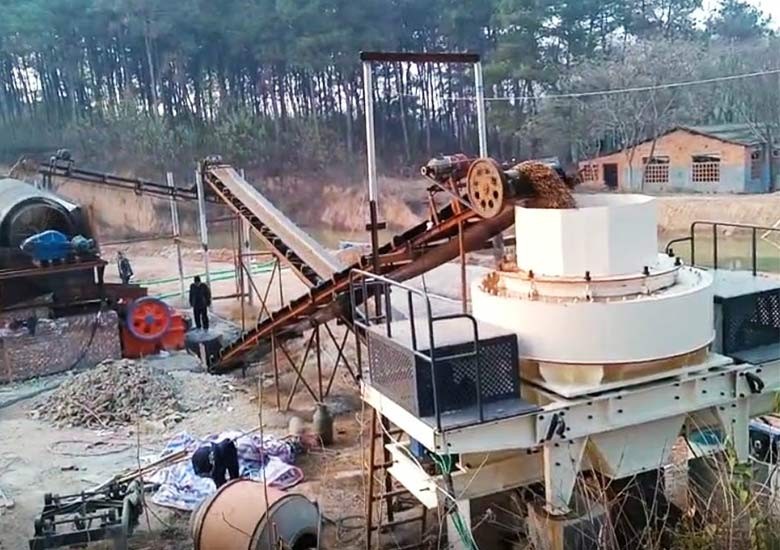 石料由振动给料机均匀的送到颚式破碎机进行粗破,粗破后的物料送进细颚式破碎机进行再次破碎,破碎后的物料由胶带输送机送进振动筛进行筛分,满足安博买球(中国)进料颗度的石子进安博买球(中国)进行制砂,不满足要求的返回细颚式破碎机重新破碎,从安博买球(中国)出来的料物,返回到振动筛重新进行筛分,筛分出的满足要求的砂子,进入洗砂机清洗,清洗后由成品输送带输送即为成品,不满足要求的砂石混合物料,送入安博买球(中国)进行再次破碎,本生产线最终形成2断闭路循环,根据用户的需要还可以进行多种配置。