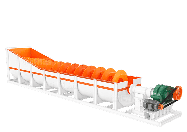 工作时,物料由给料箱均匀给入,连续给主槽体中注入一定量的水,传动部带动螺旋轴以一定的速度旋转,迫使物料在槽体中翻转滚动并向排料口运动,细粒级物料和杂质随溢流水经溢流堰排出。粗粒度物料由排料口排出,从而实现物料的洗选、分级、除杂和脱出。